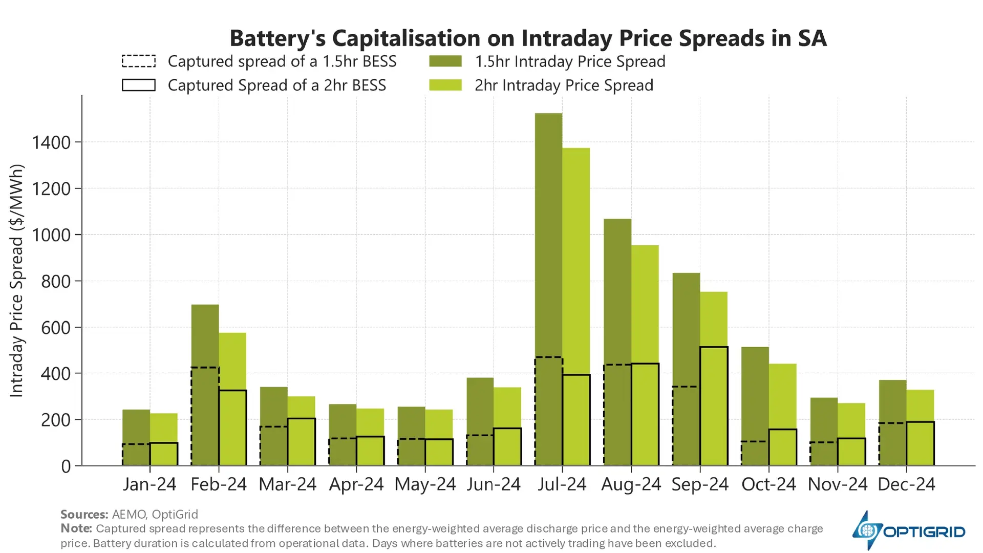 Notably, batteries sometimes capture a greater spread in months when the theoretical price spread is lower. This occurs because price spread overlooks the critical role of price volatility, which can dramatically impact battery performance and revenue capture.