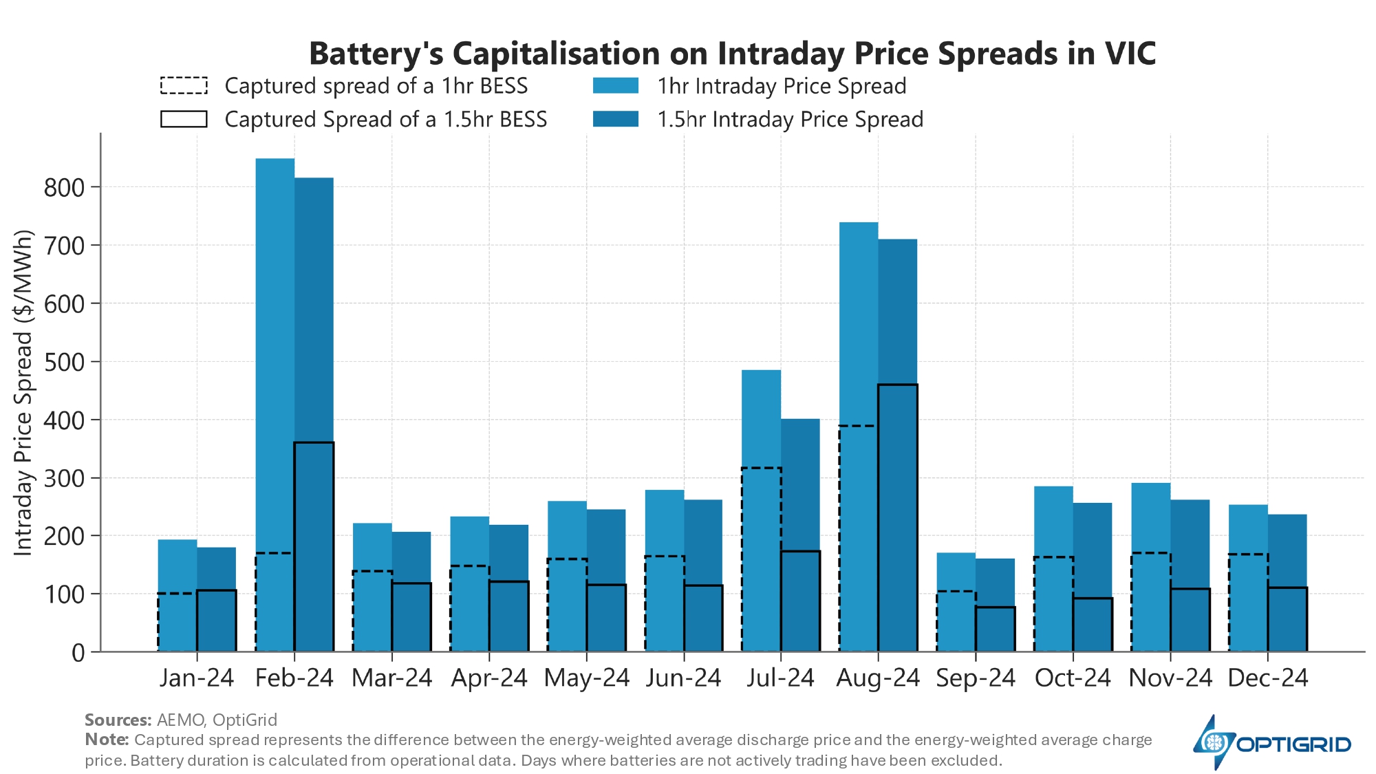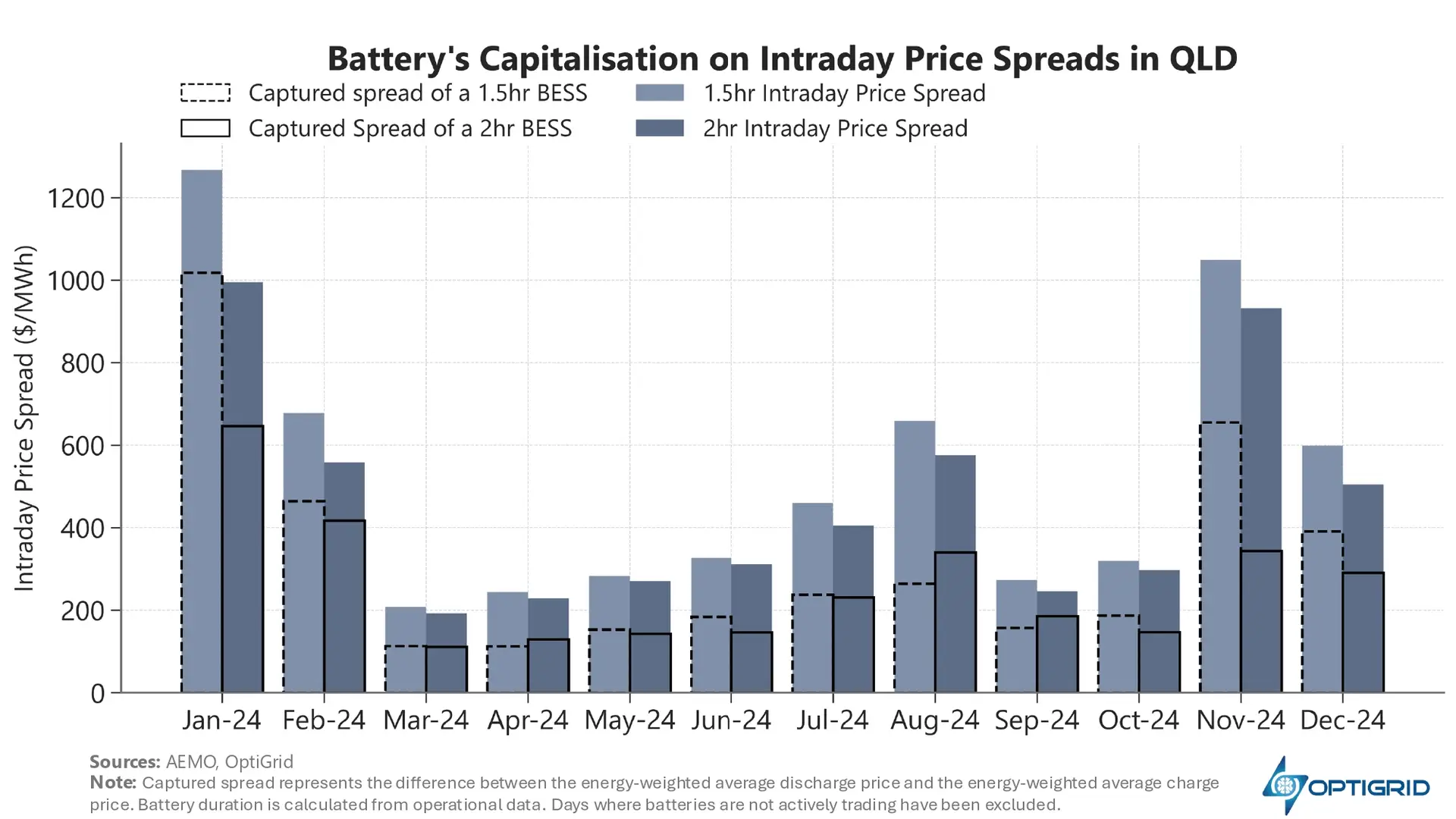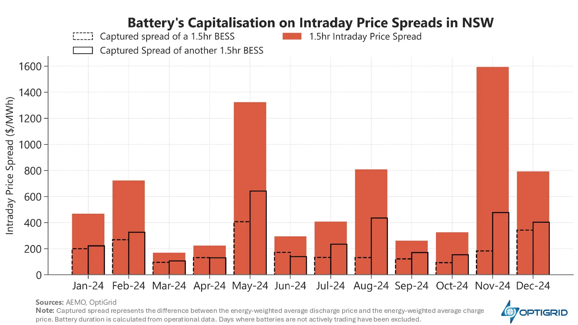 Furthermore, battery optimisation and bidding strategies vary widely between assets. Even under similar market conditions, these differences can lead to significant variations in captured spread.