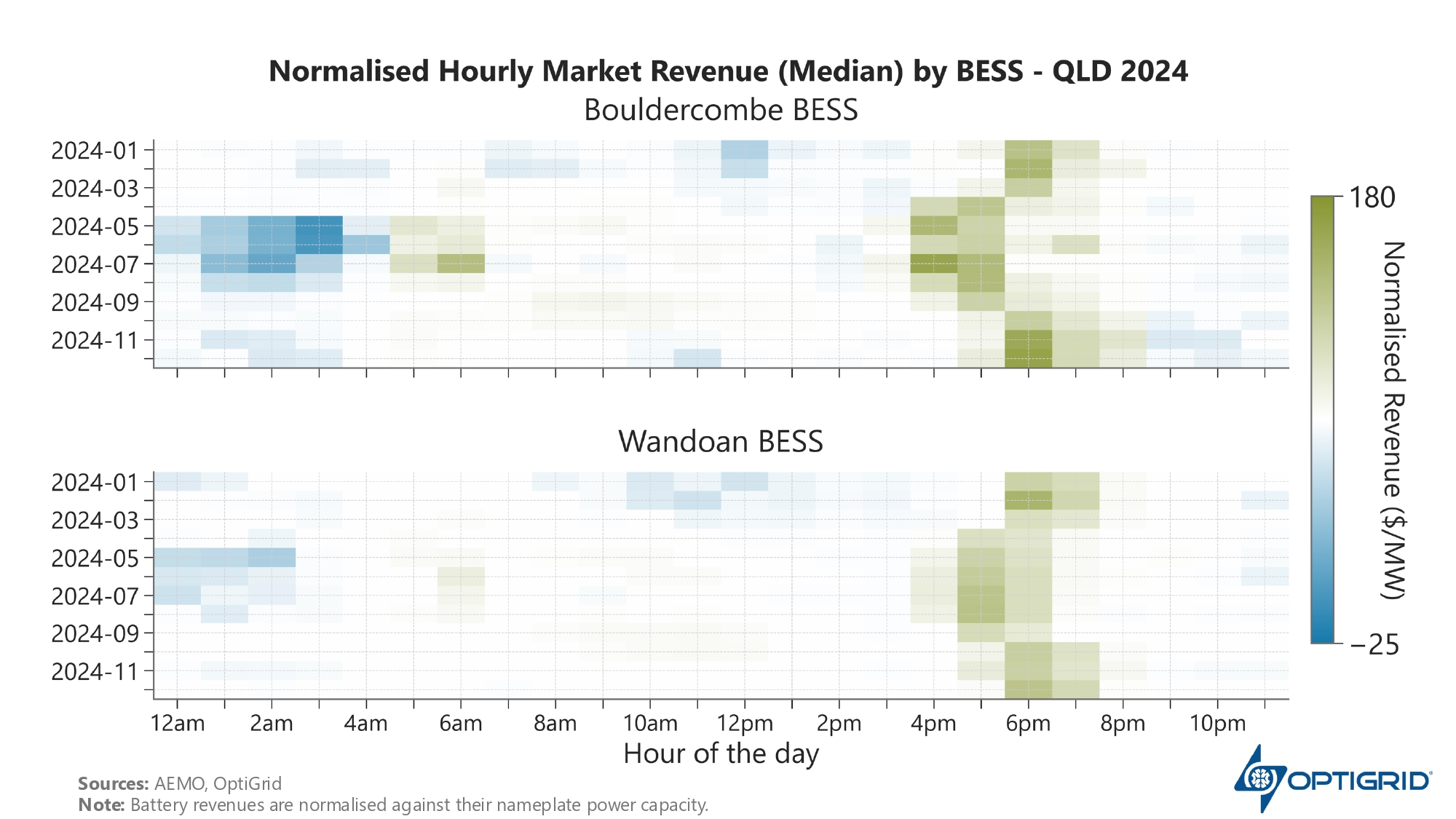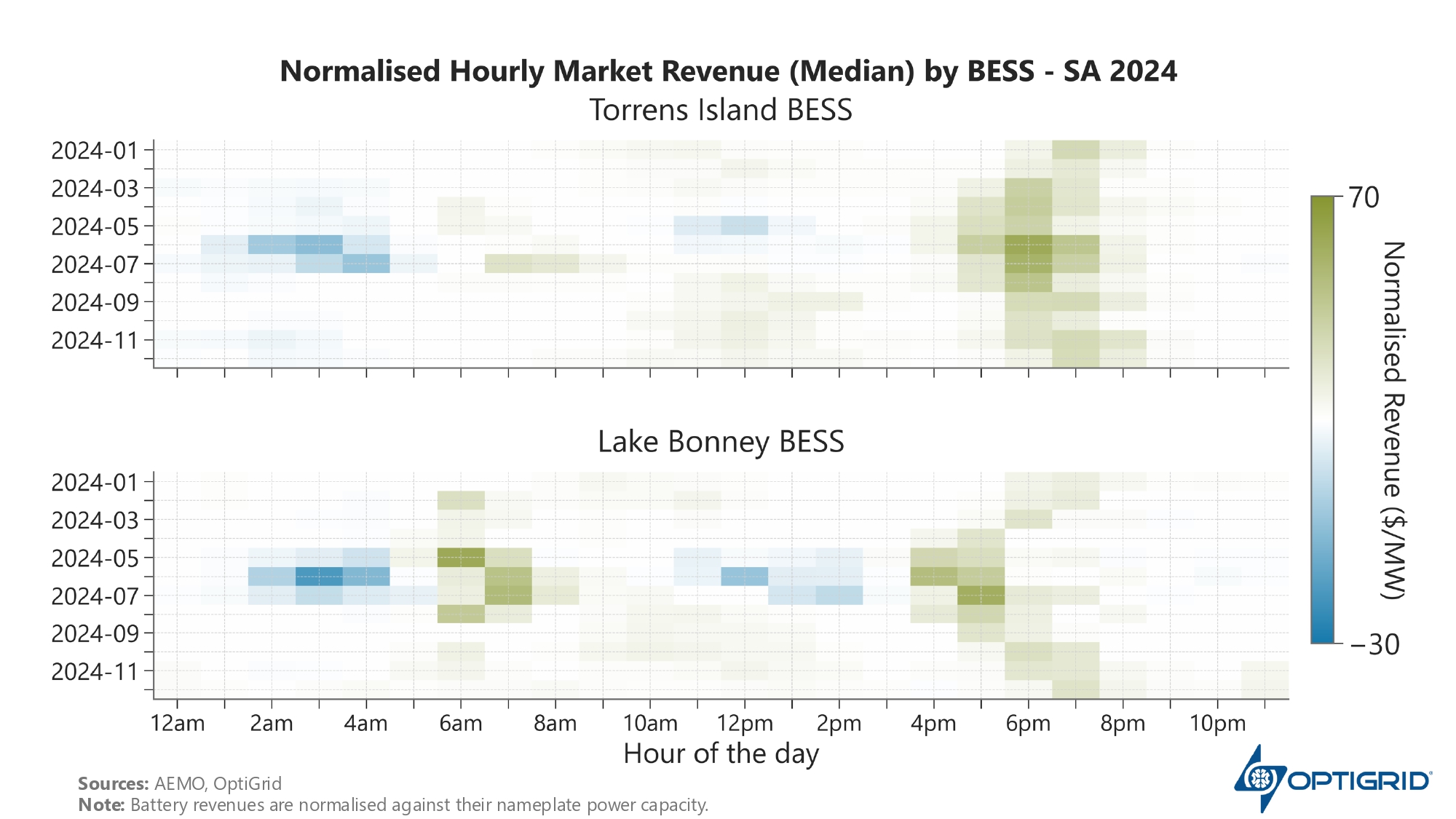 But patterns vary across regions and ownership models. In Queensland, Bouldercombe BESS had the highest normalised market revenue in 2024, while in SA, Lake Bonney BESS led on this metric. Interestingly, gentailer-operated batteries in both regions showed different behaviour, often delaying discharge and maintaining a higher state of charge into the evening. This suggests a strategic use of storage as a hedge against late-evening volatility. We also observed months where grid support services shifted typical revenue patterns, reinforcing how contractual obligations influence battery dispatch.