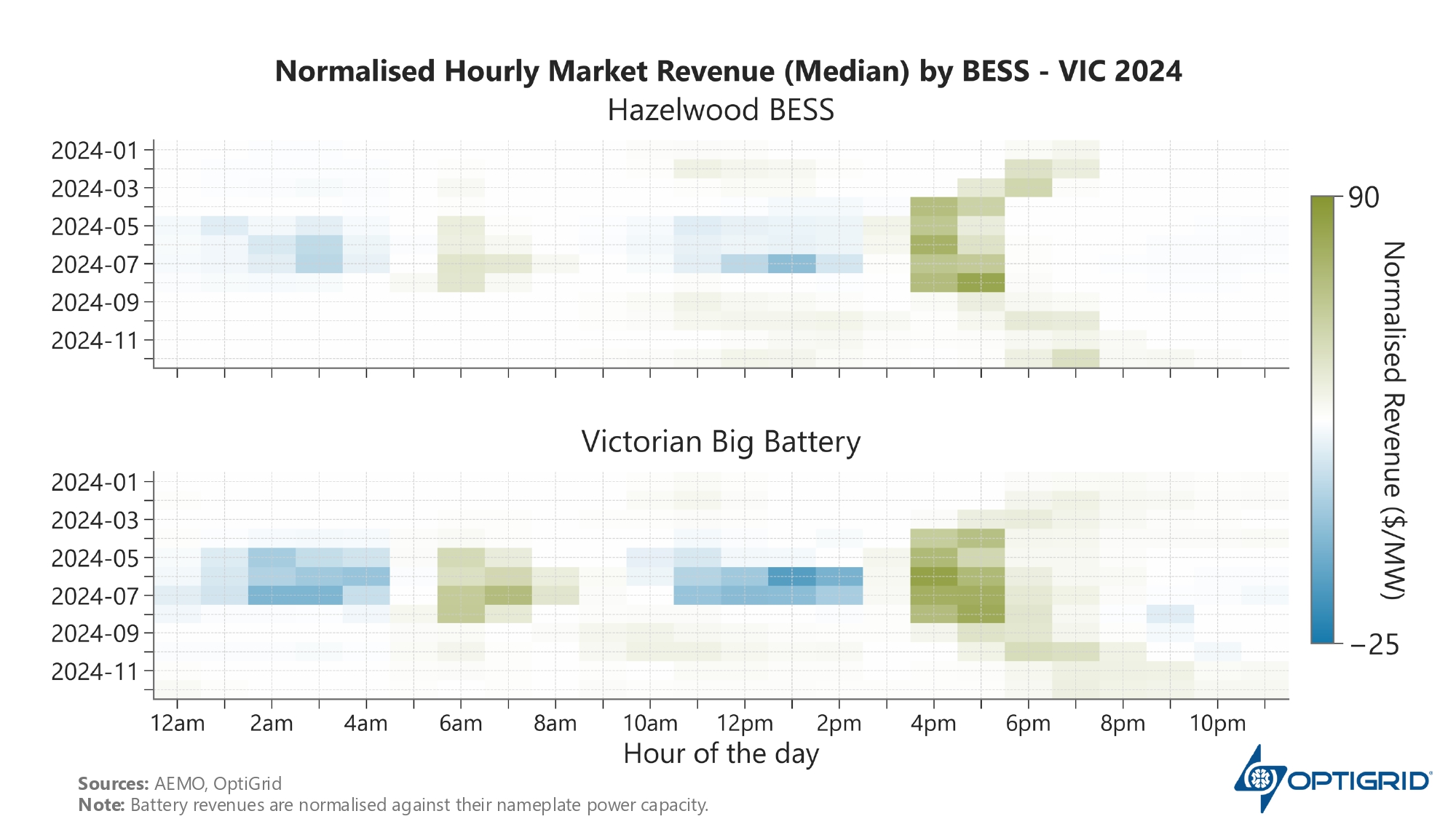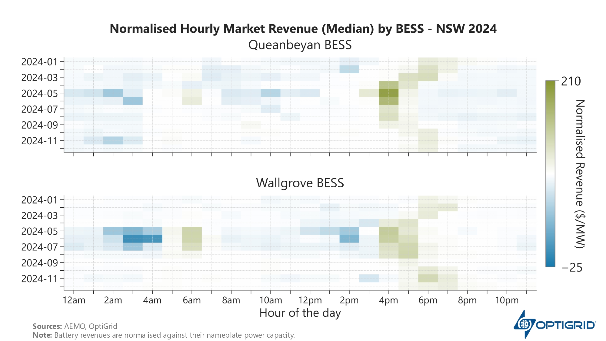 As expected, most BESS assets discharged between 4-7pm, aligning with the evening peak, while charging typically occurred in the solar-rich midday hours and occasionally after midnight when prices were lowest.